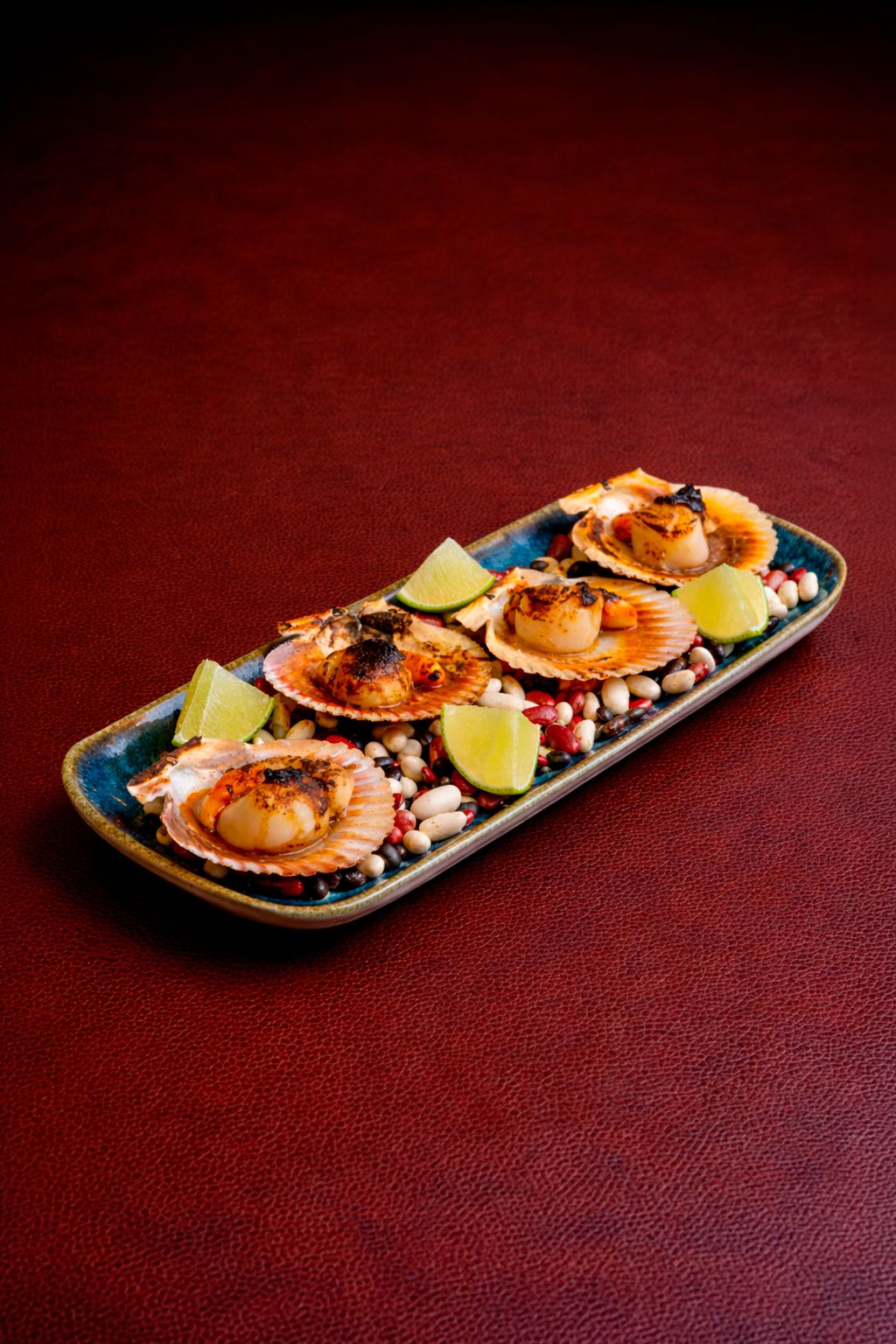 4 Ostiones en su concha, sellados y terminados con mantequilla de ajo negro