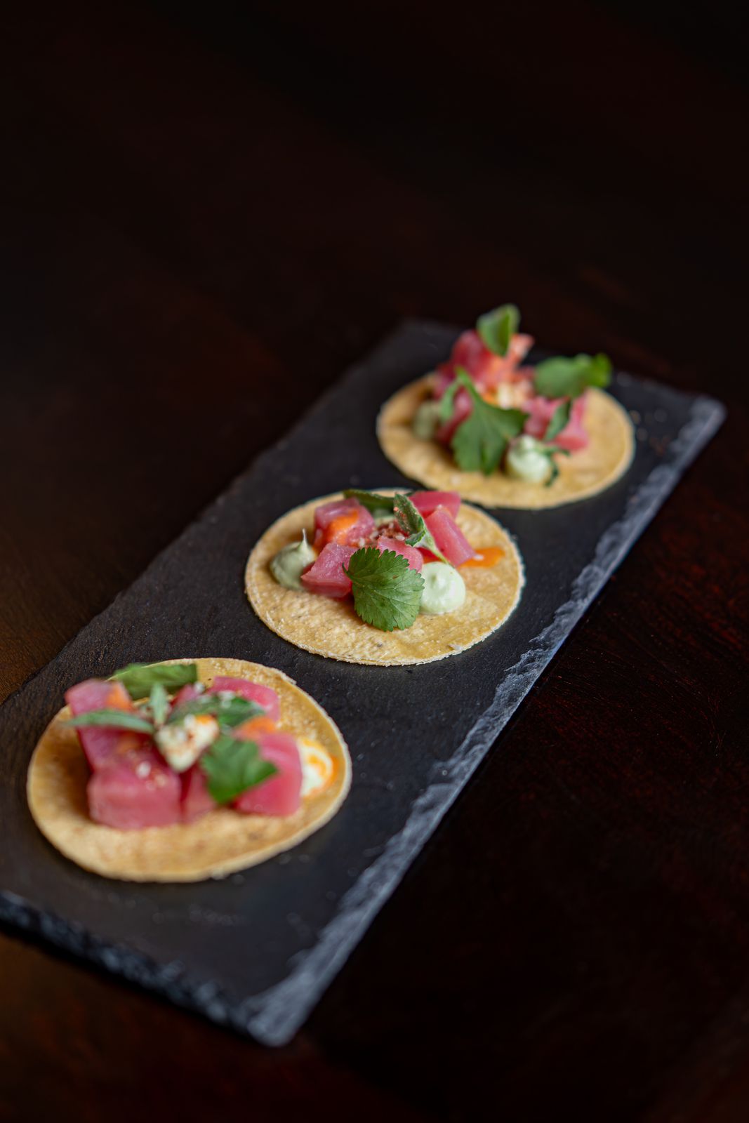 Tostadas de tortilla de maiz con atun de aleta amarilla, con salsa picante, polvo de cebolla y sesamo.