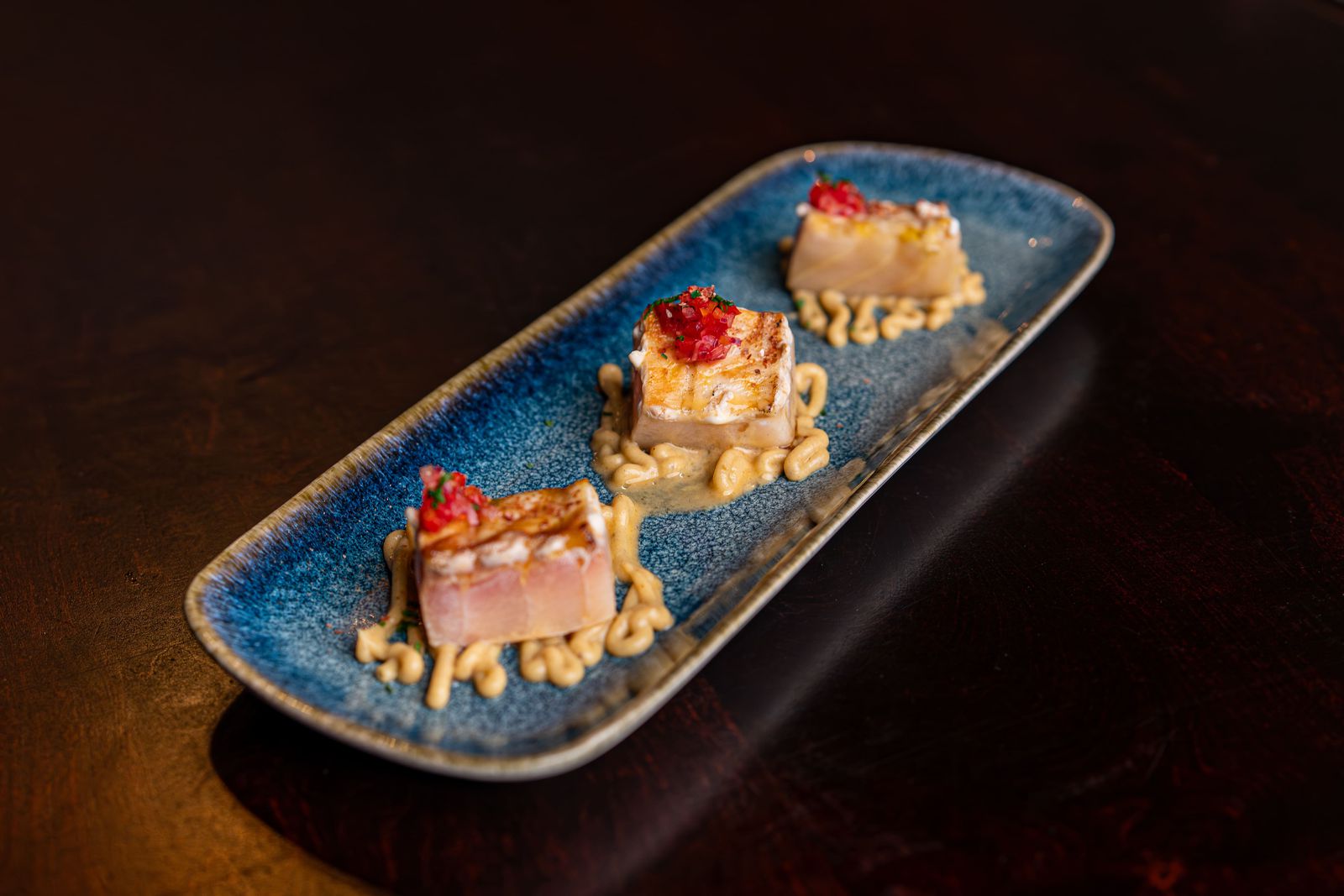 Esturión con salsa de pure de platano y emulsion de aji amarillo ahumado.