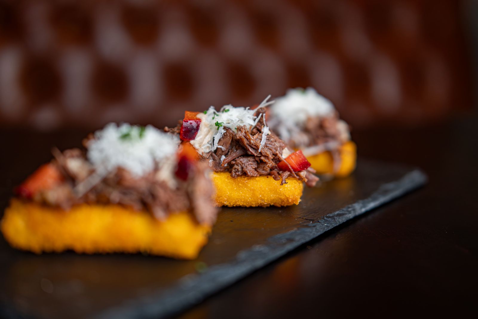 Costilla de res cocinada a fuego bajo, terminada con arrope de chañar montado en pan brioche frito en panko.