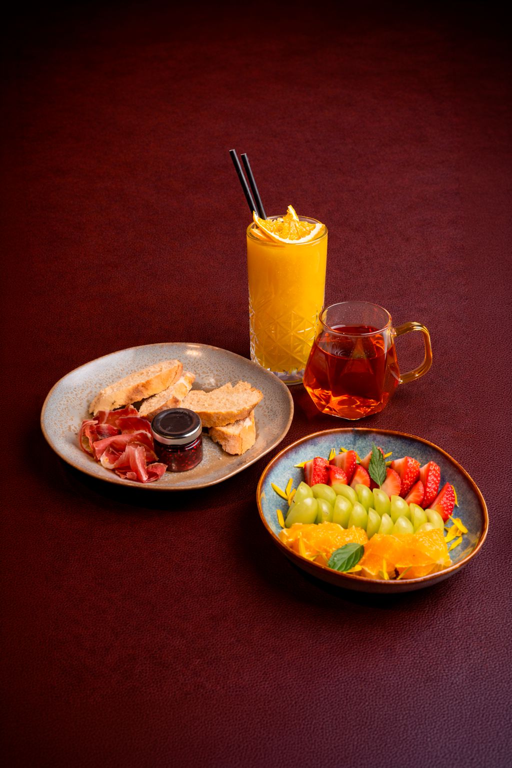 -Bowl de fruta del día -Tostadas del día con mermelada y prosciutto -Jugo del día -Bebida Caliente: Café de grano / té / infusion
