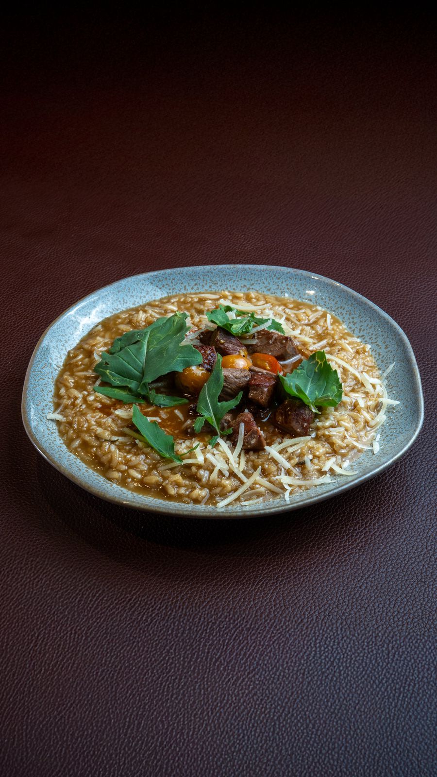 Riz arborio al dente avec morceaux de filet sautés, tomates cerises caramélisées et roquette