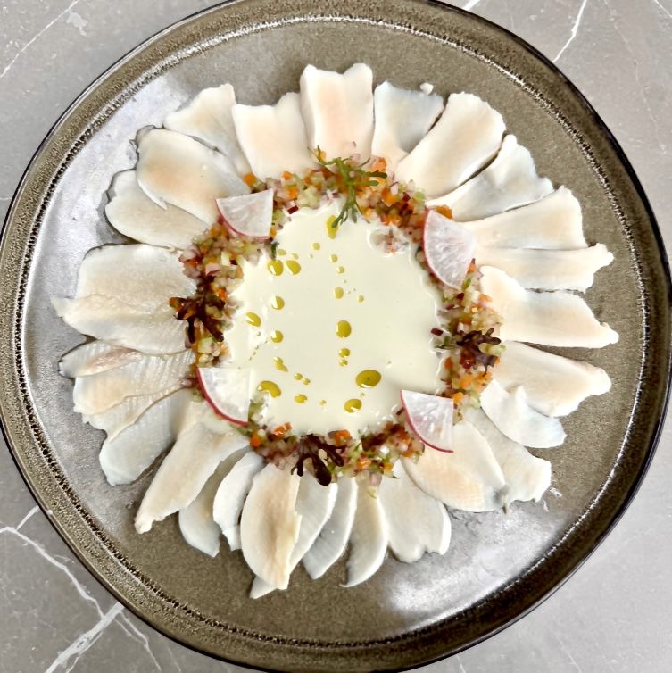 Fatias de amêijoas em um creme de amêijoas feito com iogurte, abacate, fumet (caldo de congro com legumes e ervas), limão e pimenta; acompanhado de uma mini salada de pimenta amarela, aipo, cebola roxa e salsa, temperada com limonada. Decorado com azeite de salsa e flocos de alho fritos.