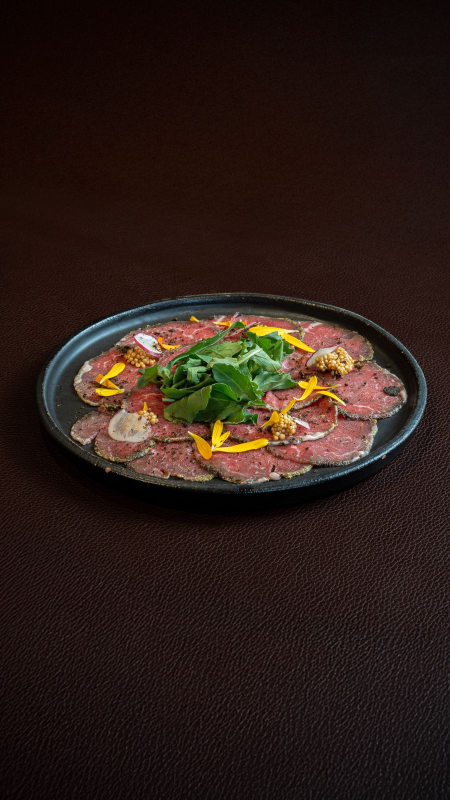 Fatias de filé com crosta de pimenta, coentro, alcaparras, azeitonas pretas e mostarda, finalizadas com mostarda em conserva, folhas de rúcula e queijo Grana Padano.