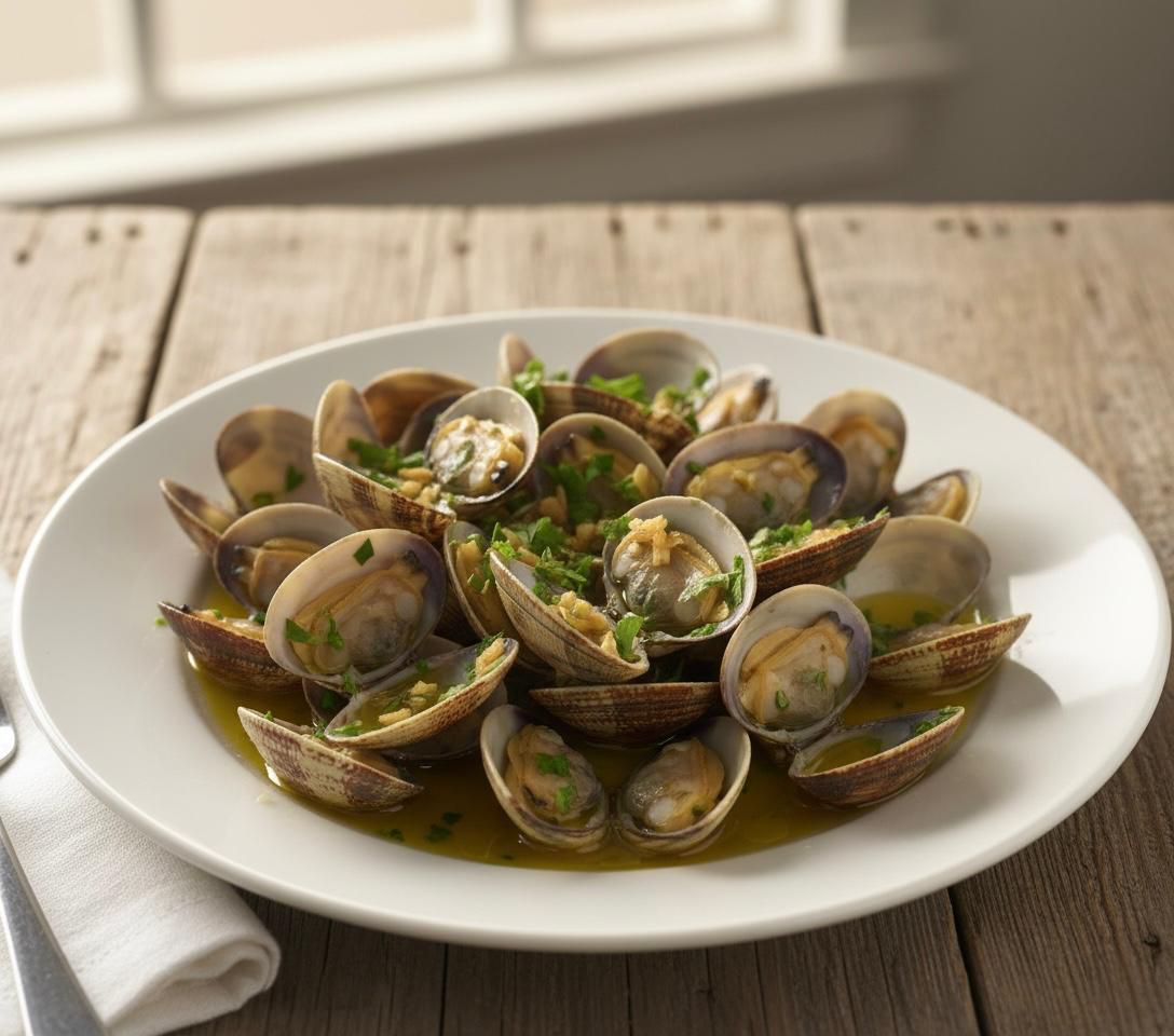Моллюски с чесноком, петрушкой, лимоном, оливковым маслом и белым вином